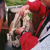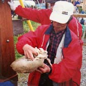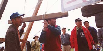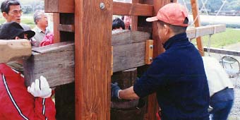 搾油機に蒸した実を入れます